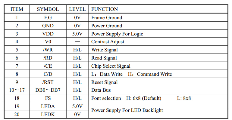 Driving Method: 1/64 Duty; 1/9 Bias